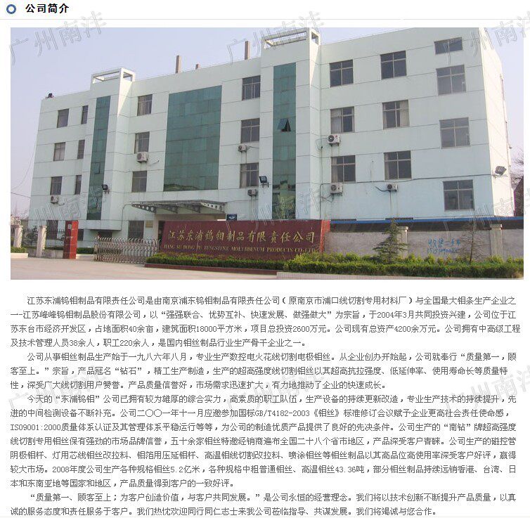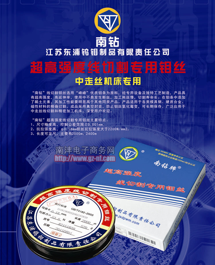 本店广州南沣电子机械有限公司是南京南钻牌钼丝的广州总代理商(可以在南钻牌钼丝官网查询http://www.jsdpwm.com/news_read.asp?id=632)。钼丝绝对正宗、足米,假一赔万。请不要和其他假冒伪劣的钼丝价格作比较。我们代理商的价格已经很低了,如果看到比本店便宜很多的钼丝请注意堤防。