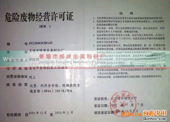 江苏瑞孚再生资源有限公司(原姜堰市峰峰金属制品厂)是拥有江苏省环保厅核定证书企业,泰州市环保局唯一指定含钨、钼,镍等处理厂商,中石化集团指定催化剂供应商。 公司以生产钨、钼系列产品为主。并兼营回收各种钨、钼废料。年产钨制品500吨,钼制品1200吨。标准化的工业厂房,先进的检测手段,一流的产品质量,产品除稳定的国内市场外,还远销日本、欧美、东南亚等国家和地区,是外贸钨、钼产品的定点厂家。