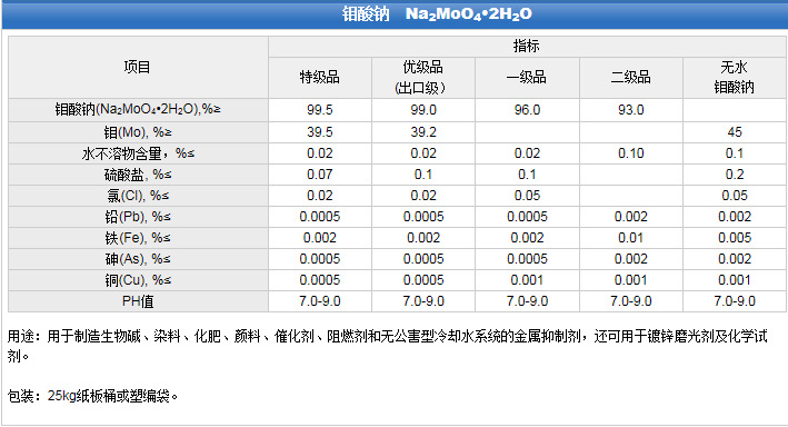 1. 用于制备钼盐及染料、颜料、催化剂、缓蚀剂等2. 用作金属缓蚀剂、除水垢剂、漂白促进剂以及皮肤和头发保护剂3. 用作分析试剂,用于生物碱测定、染料和制药工业4. 用于制造生物碱、油墨、化肥、钼红颜料和耐晒颜料的沉淀剂、催化剂、钼盐,也可用于制造阻燃剂和无公害型冷水系统的金属抑制剂,还用作镀锌、磨光剂及化学试剂。5.钼酸盐属阳极氧化膜型缓蚀剂,在阳极铁上形成亚铁-高铁-钼氧化物钝化膜而起缓蚀作用。