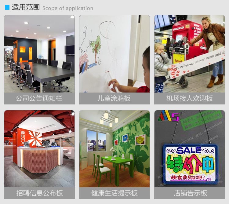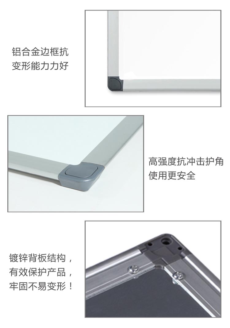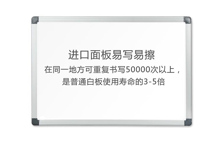 进口面板、双层烤漆,易书写、易擦净; 在同一地方可重复书写70000次以上,是普通白板使用寿命的7倍; 色彩柔和,不反光,不刺眼,有益于视力保护; 大铝合金边框,高强度ABS护角,产品结构更牢固,不易变形,外观厚重且大气,背板经过防锈处理。