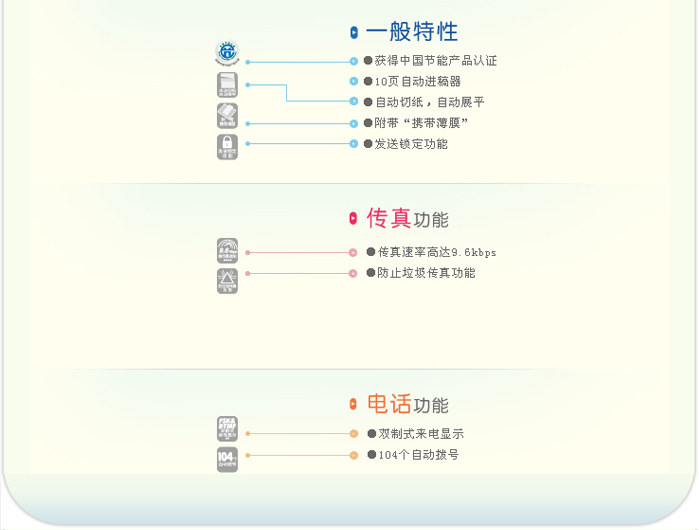 104个自动拨号记忆 密码锁功能 防垃圾传真功能 自动切纸 接收传真更加方便 104个自动拨号:4个单拨号和100个速拨号 双制式来电显示(FSK/DTMF) 传真/电话自动切换 强大的远程遥控功能