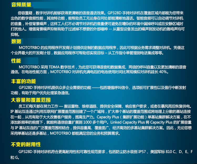 摩托罗拉GP328D对讲机通过国家防爆电气产品质量监督检验中心(CQSTEX)的检测,获防爆电气设备防爆检验合格证。其防爆标志为:ExibⅡBT3