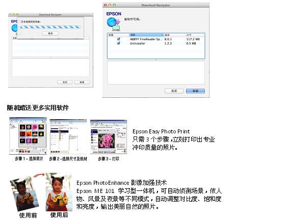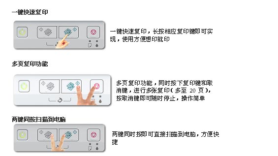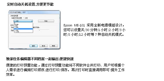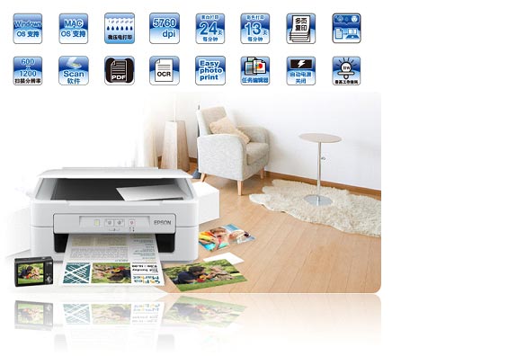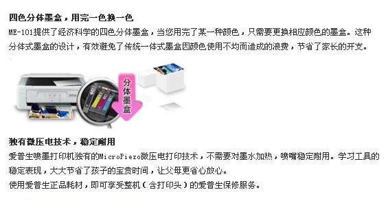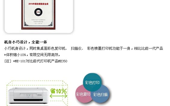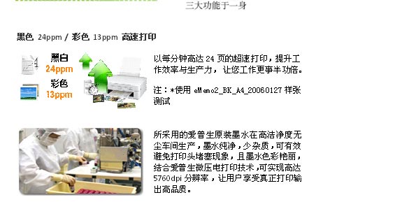 省钱!四色分体墨盒,用完一色换一色。 省心!独有微压电技术,稳定耐用。优质服务受肯定。 更时尚!机身小巧设计。 功能强大!黑色 24ppm / 彩色 13ppm 高速打印。一键快速复印。多页复印功能。两键同按扫描到电脑。定时 自动关机设置,方便更节能。独家任务编辑器不同档案一起输出,便捷快速。网络自动升级,软硬兼施。随机 赠送更多实用软件。