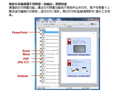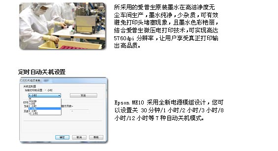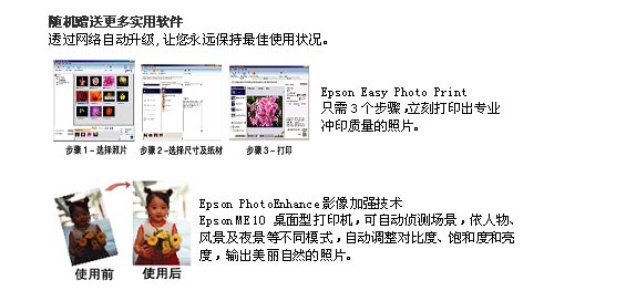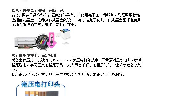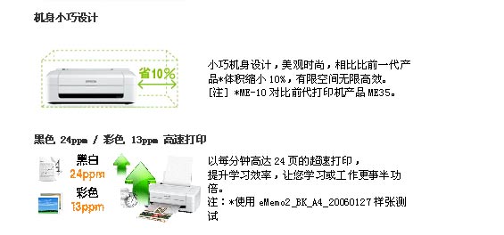 省钱!四色分体墨盒,用完一色换一色。 省心!独有微压电技术,稳定耐用。优质服务受肯定。 更时尚!机身小巧设计。 功能强大!黑色 24ppm / 彩色 13ppm 高速打印。定时自动关机设置。独家任务编辑器不同档案一起输出,便 捷快速。网络自动升级,软硬兼施。随机赠送更多实用软件。