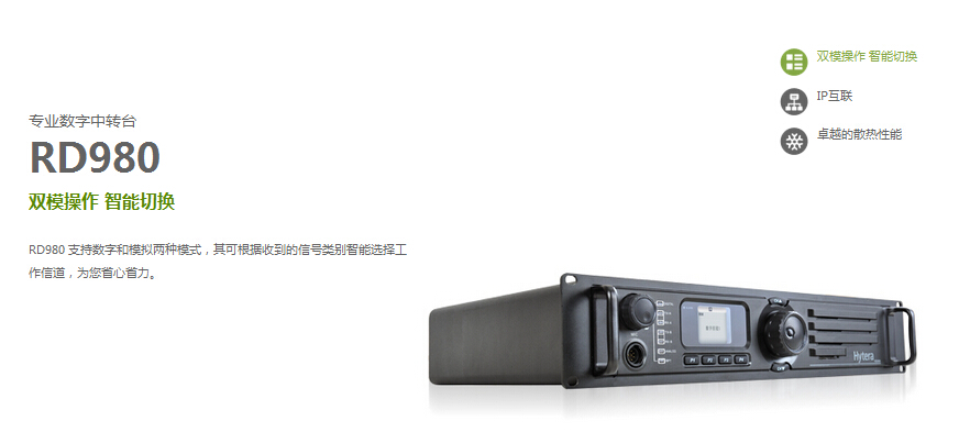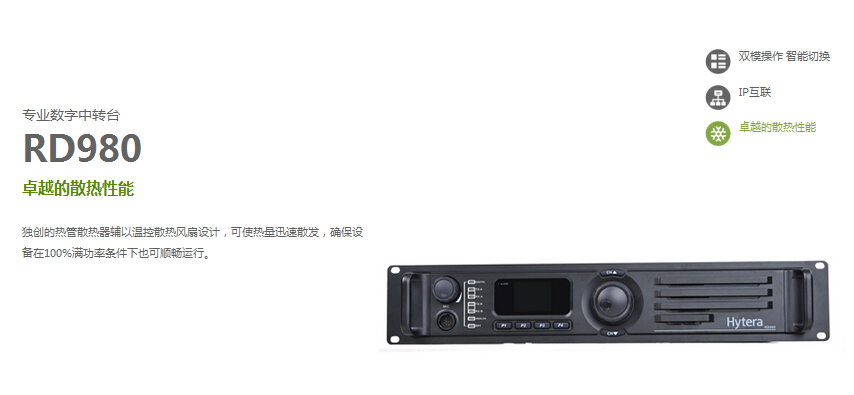 RD980支持远程(由IP端口连接到因特网)和本地诊断(由USB)PC应用软件来监控、诊断和控制中转台状态,从而提高工作效率。海能达开发的RDAC软件支持多站点网路连接,允许管理员监控接入网络的对讲机。