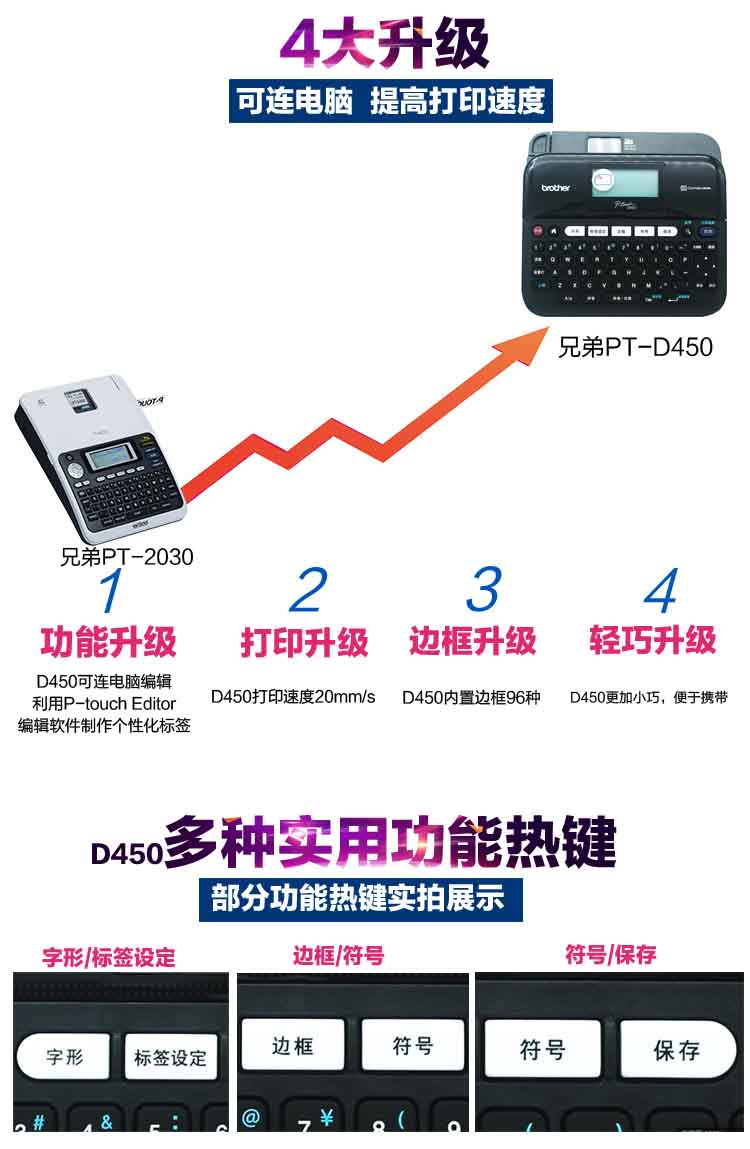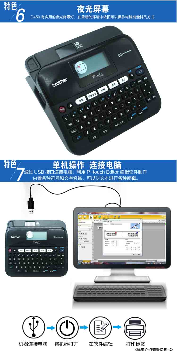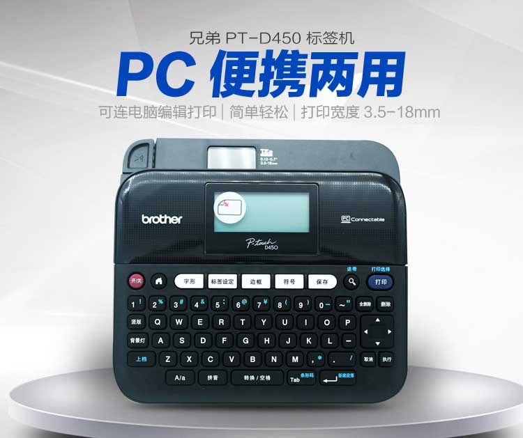 随机附件 | TZe标签色带(18mm, 1盒) 电源适配器(AD-E001) USB数据线 用户手册(含保修证) |