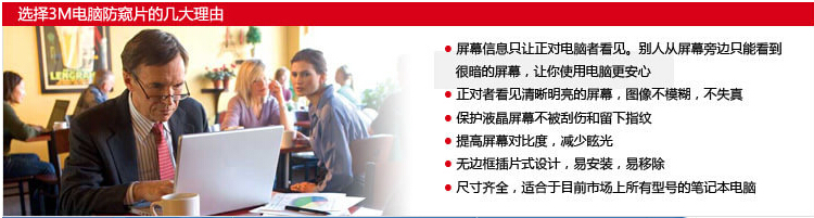 防窥保护: 屏幕仅供正对电脑者的浏览,可视区域60度 哑光表面 增加屏幕清晰对比度 易安装易移除 保护显示屏不被刮伤及损伤,闭合笔记本电脑也无需取下光学防窥片。