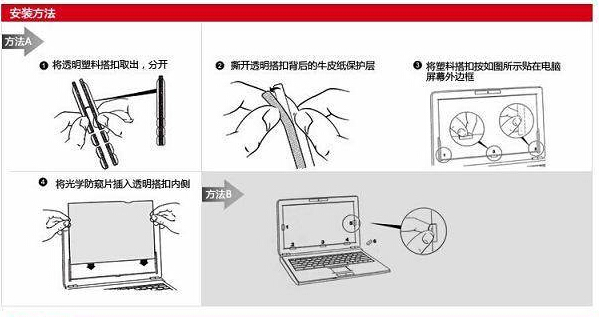 防窥保护: 屏幕仅供正对电脑者的浏览,可视区域60度 哑光表面 增加屏幕清晰对比度 易安装易移除 保护显示屏不被刮伤及损伤,闭合笔记本电脑也无需取下光学防窥片。