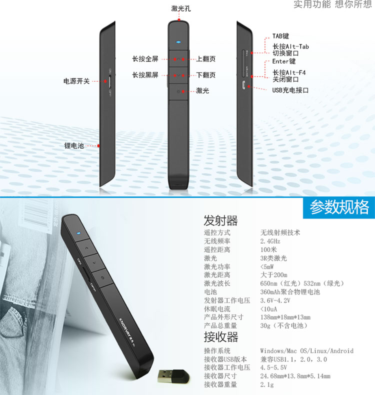 诺为 KNORVAY 翻页激光笔 N75C 绿光 充电式(黑色)
