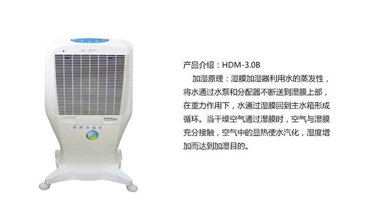 性能说明:HDM-3.0B 湿度设置精确到1%,控制自如。 缺水自动保护,指示灯提示 自动清洗加湿介质,延长使用寿命 出风口湿度90%以上,可直接对生产设备加湿 人工加水,无安装限制,底部装有万向轮,移动自如 水雾颗粒直径小于5UM,不喷雾,无“”污染,无任何水滴 省电节能,耗电量只有电极加湿机的十分之一, 无易损件 特别适合应用于电子印刷车间,控制湿度及清除静电