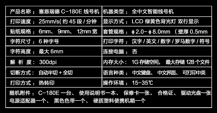 高速打印,每秒25mm的打印速度;半切打印状态下每分钟可打印45段20mm长的套管,45段20mm长的贴纸,可同时连续输入1000个字符或99段,高效率批量打印;